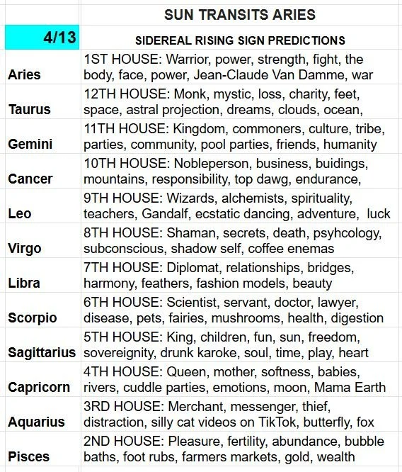 Also on April 13th, the Sun transits from Pisces into Aries, which is a story of where we begin expressing our inner warrior and getting hyperfocused on what we are hunting. The Sun creates its own light—whenever the Sun is out, we all come out, see, and express that energy. It’s in the zodiac sign of Aries, the warrior and the hunter. It’s sharp like a sword and a spear and helps us accomplish our missions. With the Sun in Aries, the world’s going to be expressing their inner warrior—less rose, more thorns. Time to focus on strength, time to focus on getting powerful. Do not be prey—time to be a predator, time to hunt and get our goals.